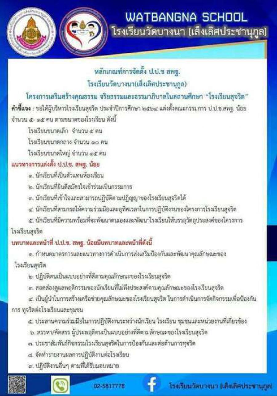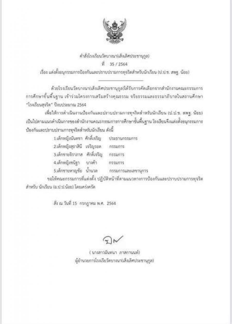 การดำเนินการเรื่องโรงเรียนสุจริตประจำปีงบประมาณ 2564 โรงเรียนวัดบางนา(เส็งเลิศประชานุกูล)
