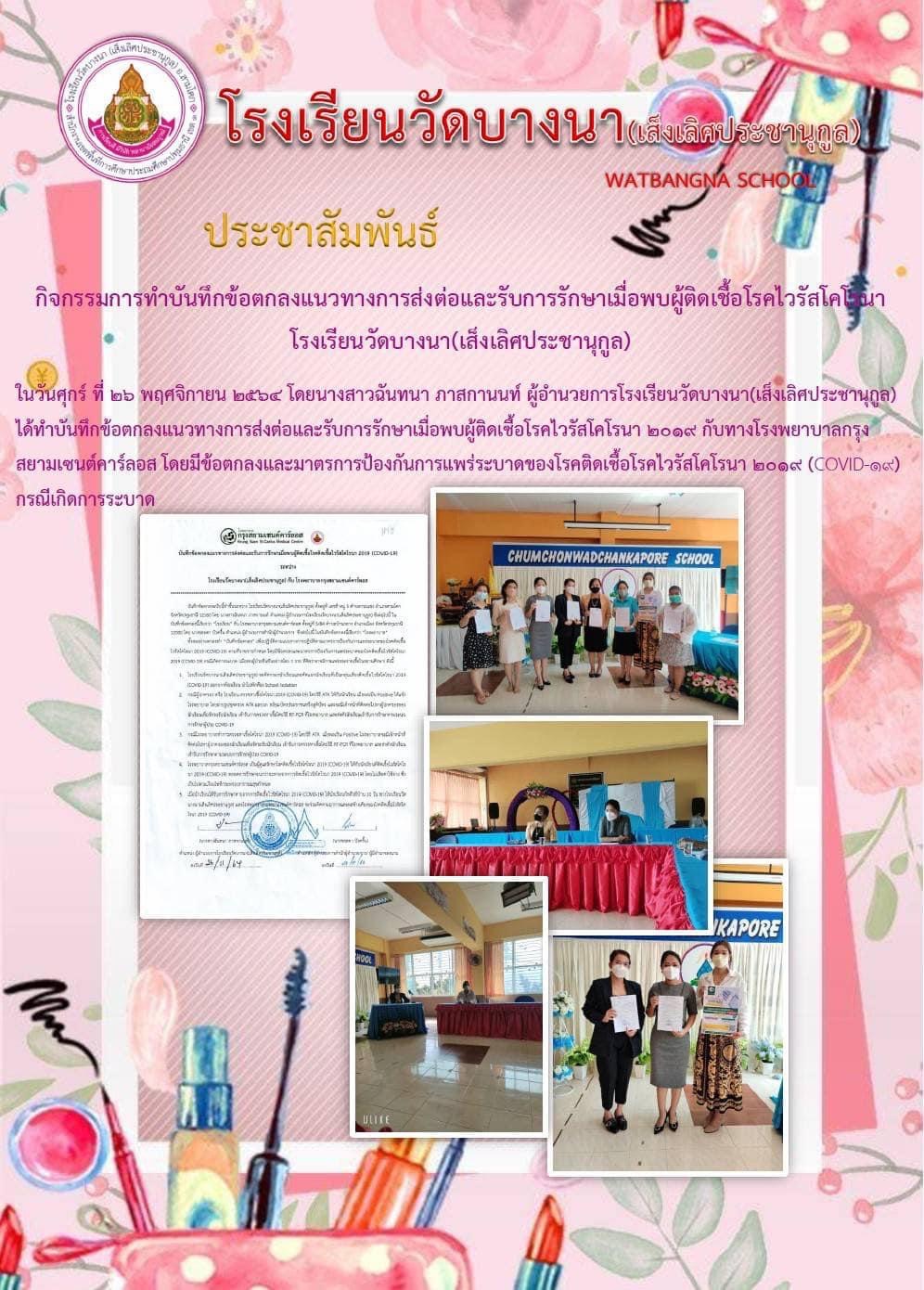 นางสาวฉันทนา ภาสกานนท์ ผู้อำนวยการโรงเรียนวัดบางนา(เส็งเลิศประชานุกูล) ได้ทำบันทึกข้อตกลงแนวทางการส่งต่อและรับการรักษาเมื่อพบผู้ติดเชื้อไวรัสโคโรนา 2019 กับทางโรงพยาบาลกรุงสยามเซนต์คาร์รอส โดยมีข้อตกลงและมาตราการป้องกันการแพร่ระบาดของโรคติดเชื้อไวรัสโคโรนา 2019 (COVID - 19) กรณีเกิดการระบาด ณ โรงเรียนชุมชนวัดจันทร์กระพ้อ อ.สามโคก จ.ปทุมธานี