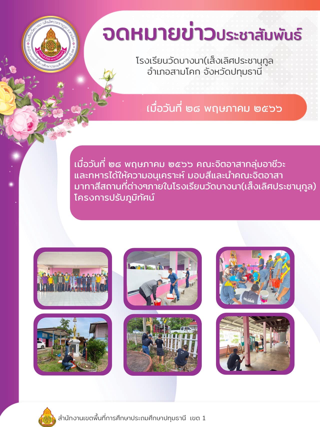 คณะจิตอาสากลุ่มอาชีวะและทหารได้ให้ความอนุเคราะห์ มอบสีและนำคณะจิตอาสามาทาสีสถานที่ต่างๆภายในโรงเรียนวัดบางนา(เส็งเลิศประชานุกูล)