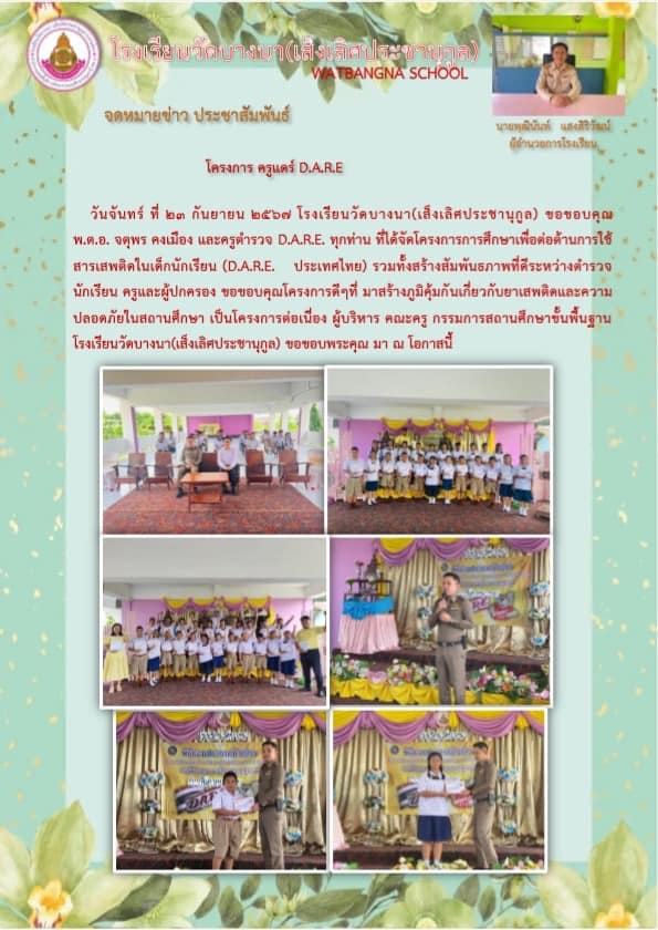 โรงเรียนวัดบางนา(เส็งเลิศประชานุกูล) ขอขอบคุณพ.ต.อ. จตุพร คงเมือง และครูตำรวจ D.A.R.E. ทุกท่าน ที่ได้จัดโครงการการศึกษาเพื่อต่อต้านการใช้สารเสพติดในเด็กนักเรียน (D.A.R.E. ประเทศไทย)