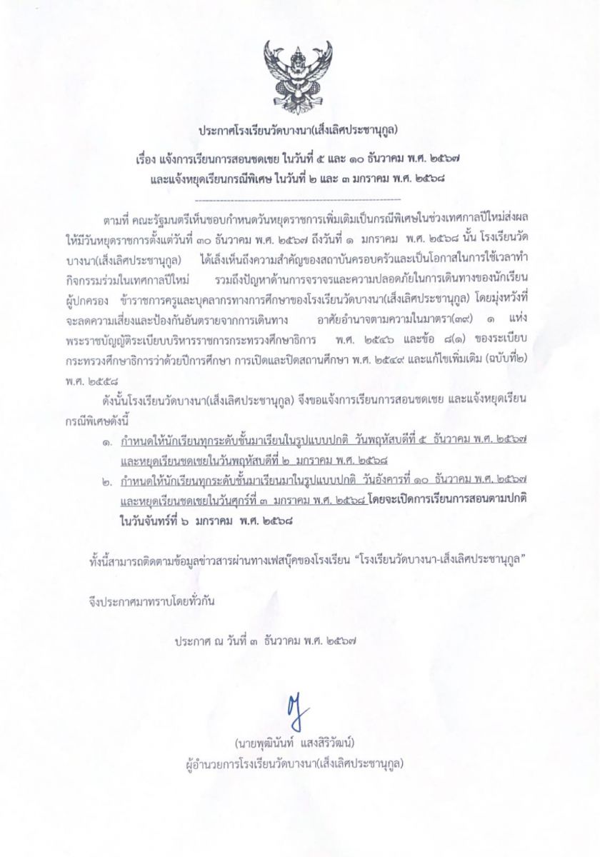 ประกาศโรงเรียนวัดบางนา(เส็งเลิศประชานุกูล) เรื่อง แจ้งการเรียนการสอนชดเชยในวันที่ 5 และ 10 ธันวาคม 2567และแจ้งหยุดเรียนกรณีพิเศษในวันที่ 2-3 มกราคม 2568