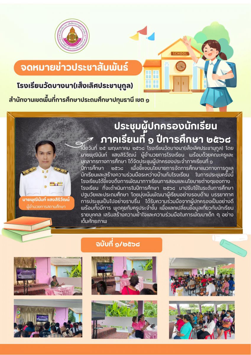 ประชุมผู้ปกครองประจำภาคเรียนที่ ๑ ปีการศึกษา ๒๕๖๘ เพื่อชี้แจงนโยบายการจัดการศึกษาแนวทางการดูแลนักเรียนและสร้างความร่วมมือระหว่างบ้านกับโรงเรียน